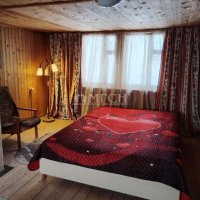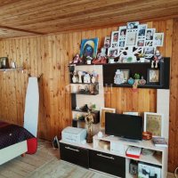 Вход в дом осуществляется через веранду (11 кв.м). Далее на первом этаже: прихожая - 6 кв.м, совмещенный санузел - 4 кв.м, кухня - 8 кв.м, спальня - 8 кв.м. Окна на первом этаже пластиковые, на втором - добротные, двойные деревянные рамы. Второй этаж - это одна комната - 22 кв.м. На втором этаже условное зонирование на гардеробную, зону отдыха с большой кроватью с ортопедическим матрасом и центральная часть, где расположилась небольшая стеночка.