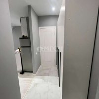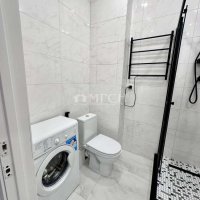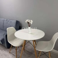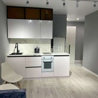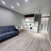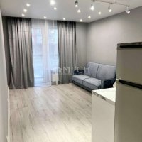 Квартира обставлена мебелью. Кухня со встроенной техникой и разделена со спальной зоной.